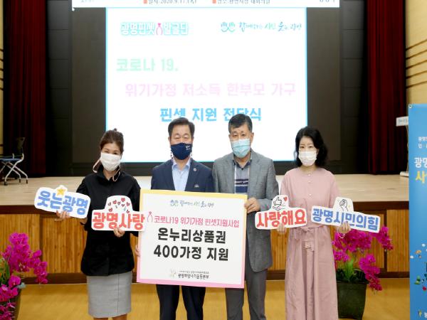 광명시사회복지협의회-광명희망나기운동본부는 ‘코로나19-STOP’기부릴레이를 통해 모금된 희망성금 중 1억 원을 광명형 핀셋지원에 사용하기로 하고 이날 전달식에서 1차로 온누리 상품권 7620만원을 전달했다.