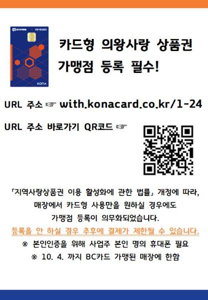 그동안 카드형 의왕사랑 상품권은 사업주가 시에 별도로 가맹점 등록 신청을 하지 않아도 BC카드 가맹점과 연동하여 카드 결제가 가능했다.