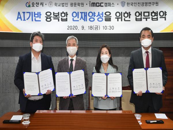 이날 협약식에서는 AI 스마트 미래도시를 지향하는 오산시와, ICT를 기반으로 로봇ㆍAI 관련 인프라가 풍부한 학교법인 광운학원, iMBC캠퍼스, 한국안전경영연구원(주) 등이 적극 협력해 핵심 인재양성을 위해 상호 협력하기로 했다.