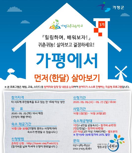 [KNT한국뉴스타임] 가평군 예비사회적기업 협동조합 공감21 부설 가평귀촌귀농학교(교장 박천행)는 10월 5일부터 진행되는 “제3기 가평에서 먼저(한달) 살아보기“ 참여자를 9월 17일부터 모집한다.