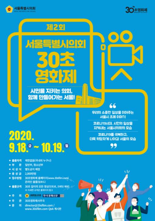 서울특별시의회(의장 김인호)가 작년에 이어 두 번째로 ‘제2회 서울특별시의회 30초 영화제’를 개최한다. 서울시의회 의정활동 모습과 서울시의회가 제·개정한 조례 내용을 시민들과 나누고, 또 이에 대한 시민들의 생각과 요구사항을 전해 듣는 소통의 기회로 삼기 위해서이다.