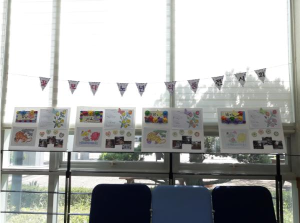 전시작품은 어르신들이 직접 만든 명패, 시 작품, 민화도, 활동사진 등이다.