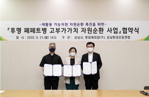 [KNT한국뉴스타임] 성남시가 9월 21일 민·관·기업 투명 폐페트병 자원 순환 확대를 위한 업무협약을 롯데케미칼(주), 성남환경운동연합과 체결했다.