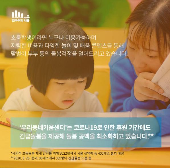 공적 돌봄의 사각지대로 여겨졌던 초등생 양육을 촘촘하게 지원하기 위해 서울시는 2018년부터 ‘우리동네키움센터’를 운영 중으로, 사회적 초등돌봄 체계 강화를 위해 2022년까지 서울 전역에 총 400개소를 설치할 예정이다.