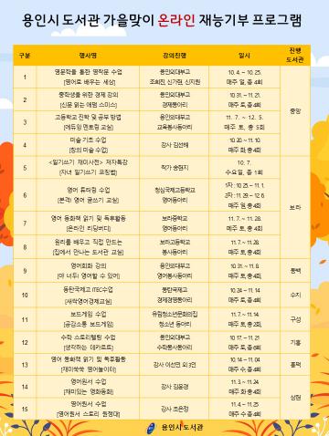 [KNT한국뉴스타임] 용인시도서관은 22일 가을을 맞아 시민들의 재능기부로 운영되는 다양한 온라인 독서?문화 프로그램을 개설했다고 밝혔다.