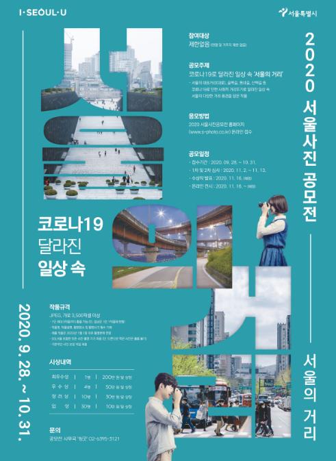 9월 28일부터 10월 31일까지 진행되는 ‘2020 서울사진공모전 <서울의 거리>’는 연령 및 거주지 제한 없이 누구나 참여할 수 있으며, 2020년 1월 1일 이후 촬영한 작품으로 서울의 대표거리(대로), 골목길, 동네길, 산책길 등 코로나19로 달라진 일상 속 ‘서울의 거리’ 풍경을 잘 표현한 작품이면 된다.