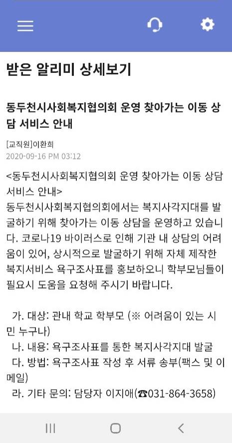 무한돌봄네트워크팀은 복지사각지대 발굴 노력의 일환으로 지난 9월 11일 경기도동두천양주교육청을 직접 방문하여, 복지욕구 조사표를 통한 소외계층이 발굴될 수 있도록 협조를 요청하였고, 교육청에서 관내 초·중·고등학교 학부모에게 알리미 서비스를 활용하여 해당소식을 전파하여, 제보전화를 받게 되었다.
