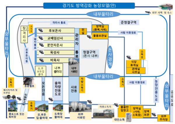 연구에서 제시된 ‘방역강화 농장모델’을 살펴보면, 내·외부 울타리를 설치해 구역을 나누고, 내부 울타리 안에서도 돈사경계를 기준으로 준청결구역과 청결구역으로 나눠 관리의 효율화를 꾀했다.