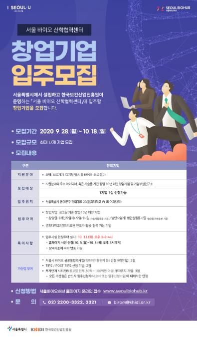 [KNT한국뉴스타임] 서울시는 오는 11월 개관할 ‘서울 바이오 산학협력센터(동대문구 경희대로 23)’의 입주기업 17개사를 10월 18일(일)까지 모집한다고 밝혔다. 경희대학교 舊 이과대학 안에 조성되며, 입주기업에는 최대 4년간 사무공간 임대료 무상지원, 기업별 성장패키지 지원, 홍릉 강소연구개발특구 지정에 따른 세게 감면 혜택 등이 제공된다.