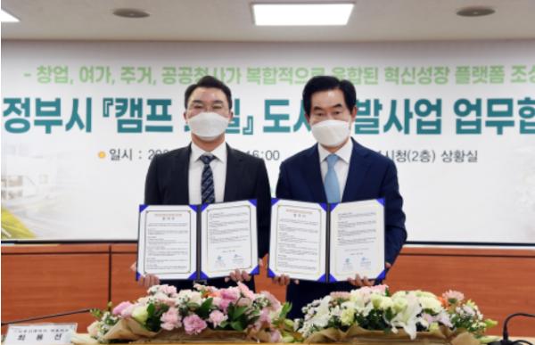 [KNT한국뉴스타임] 의정부시는 9월 28일 ㈜다온디앤아이와 금오동 209번지 일원 반환공여지 캠프 카일에 창업, 주거, 여가, 공공청사가 복합적으로 융합된 혁신성장 플랫폼을 조성하고자‘캠프 카일 도시개발사업 업무협약(MOU)’을 체결했다고 밝혔다.