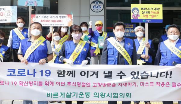 성시형 의왕시협의회 회장과 회원 20여명이 함께한 이날 캠페인은 지나가는 시민들에게 코로나19 예방을 위한 사회적 거리두기 및 마스크 착용 생활화를 홍보하고 시민 모두의 안전을 위해 추석 연휴 이동 자제에 동참해 줄 것을 호소하였다.