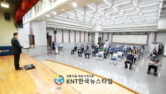 [한국뉴스타임=명기자] 5일 오전 경기도의회 장현국 의장 (더민주, 수원7)이 경기도의회사무처 1층 대회의실에서 열린 ‘10월 월례조회’에서 코로나19 대처에 모범을 보인 의회사무처 직원을 격려했다.