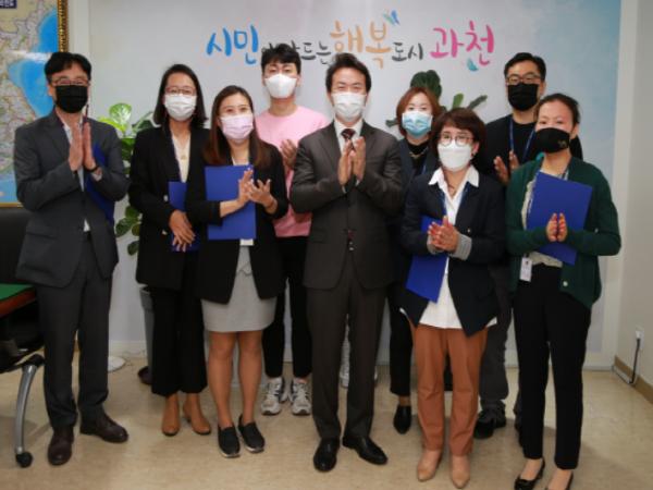 이번에 시장 표창을 받은 공무원은 과천시립요양원 국·도비 확보 및 행정절차 기간 단축에 기여한 사회복지과 지재현 노인복지팀장, 양재천 흐름 개선을 통한 수질 및 하천 경관 개선에 기여한 환경위생과 주종순 주무관, 비대면 소통창구 개발로 시민과의 소통 지속 유지에 기여한 자치행정과 안미영 시민사회소통팀장, 개발사업지 내 주민을 위한 문화체육시설 건립 추진한 도시개발과 김나정 주무관, 코로나19에 따른 착한임대인 재산세 감면 알림 홍보문을 건축물 소유주에 개별 발송한 세무과 김수민 주무관 등이다.