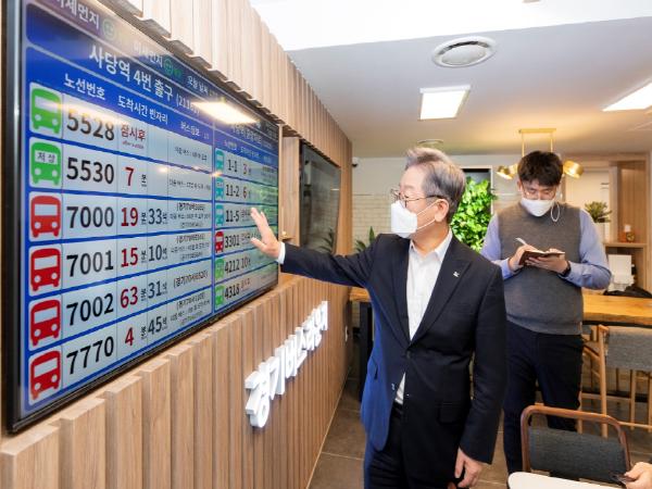 [KNT한국뉴스타임] 이재명 경기도지사가 6일 퇴근시간 무렵, 광역버스 이용객들을 위한 새로운 휴식공간인 ‘경기버스라운지’를 찾아 관리 근무자를 격려하고 시설 곳곳을 점검했다.
