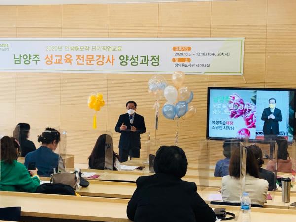 수강생 격려차 참석한 조광한 시장은“최근 텔레그램 N번방 사건 등 청소년들이 가담한 성범죄 소식을 접하고 마음이 아팠다.”면서, “여기 계신 여러분께서 전문강사 교육 이수 후, 우리 지역 청소년들이 인터넷 검색으로 성(性) 지식을 얻는 것이 아니라 전문가로부터 신뢰할 수 있는 정보를 얻어 몸과 마음이 건강한 성인으로 성장할 수 있도록 도움을 주시길 바란다 .”고 당부의 말을 전했다.