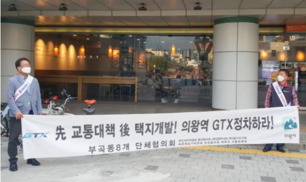 [KNT한국뉴스타임] 의왕시는 부곡동 통장협의회가 7일 관내 주민 및 의왕역 이용객을 대상으로 GTX-C노선 의왕역 정차의 당위성 등을 홍보하고 정차를 촉구하는 캠페인을 가졌다고 밝혔다.