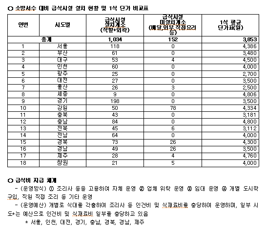 국민의힘 최춘식 국회의원(경기 포천시·가평군)이 지난 9월 소방청으로부터 입수한 ‘소방서수 대비 급식시설 설치 현황 및 단가 비교표’에 따르면 전국 시도 별 1식 평균단가가 3,853원으로 서울시 결식아동 급식단가(1식 6천원) 보다 낮았으며 이 중 44.4%는 평균단가 이하의 예산이 책정된 것으로 나타났다.