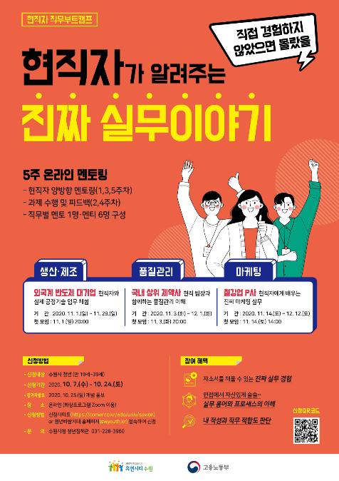 ‘현직자가 알려주는 진짜 실무이야기’는 만 19~39세 수원 청년 대상으로 기업에서 생산·제조, 품질관리, 마케팅 등 업무를 담당하는 현직자들이 원격 화상 회의 프로그램(ZOOM)을 활용해 실무 경험과 지식을 알려주는 프로그램이다.