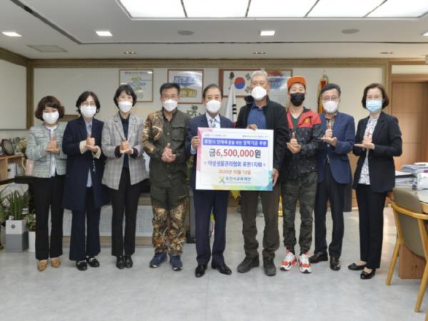 [KNT한국뉴스타임] 포천시는 야생생물관리협회 포천1지회에서 12일, 회원 38명의 뜻을 모아 포천시 교육 발전을 위한 장학 기금 650만 원을 (재)포천시교육재단에 기탁했다고 밝혔다.