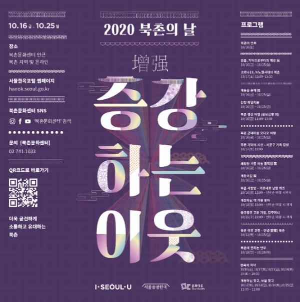 [KNT한국뉴스타임] 서울시와 사)문화다움은 10월 16일(금)~25일(일) 열흘간, ‘증강(增强)하는 이웃’을 주제로 코로나19로 지친 북촌 주민과 시민들에게 안부를 전하며 소통과 유대를 강화하는 ?2020 북촌의 날? 행사를 개최한다.