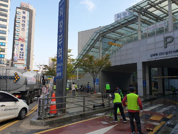 현재 운영 중인 뉴딜근로자와 양 기관의 직원 참여로 의정부역 서부광장 주변의 노숙인으로 인한 악취와 위생문제 해결 및 쾌적하고 안전한 환경 조성을 위해 물청소와 소독을 대대적으로 전개하였다.