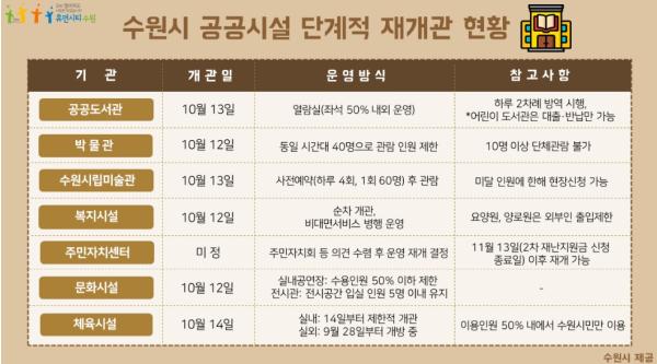 [KNT한국뉴스타임] 정부가 ‘사회적 거리두기’ 단계를 10월 12일부터 1단계로 조정하면서 수원시가 공공시설을 제한적으로 개관한다.