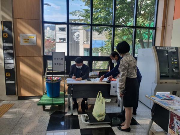 아이스팩 수거사업은 생활쓰레기 20% 감량을 위해 가정 내에서 사용한 아이스팩을 종량제봉투로 교환해주는 사업으로 지난달부터 시행되고 있다. 이영재 센터장을 비롯한 행정복지센터 직원들이 교대로 순번을 정해 수거 접수를 받고 있다.