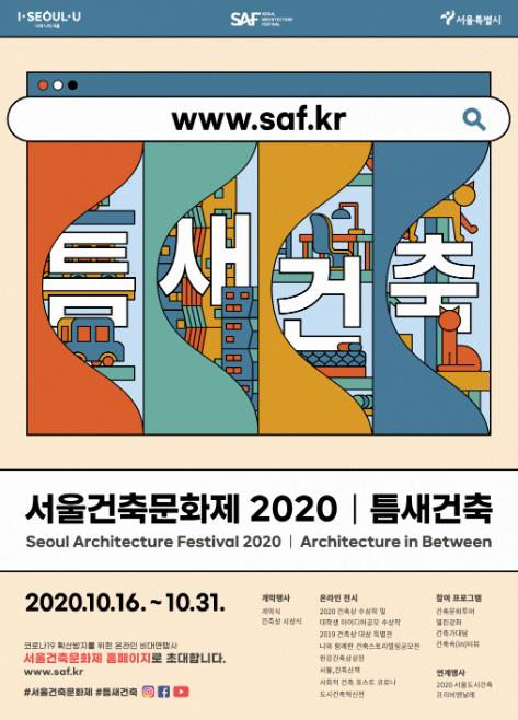 [KNT한국뉴스타임] 서울시는 서울 시민의 축제『서울건축문화제 2020』가 10월 16일(금) 개막식을 시작으로 본격 진행된다고 밝혔다. 올해로 제12회를 맞이한 ?서울건축문화제?는 '틈새건축(Architecture in Between)' 을 주제로 10월 31일(토)까지 서울건축문화제 공식 홈페이지(www.saf.kr)를 통해 개최된다.
