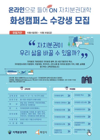[KNT한국뉴스타임] 화성시 자치분권대학 화성캠퍼스가 30일까지 ‘자치분권 기본과정’수강생을 모집한다.