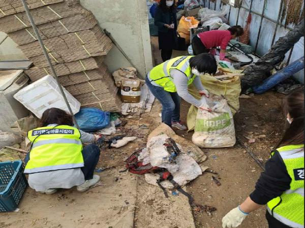 환경정비를 위해 부곡동 행복마을관리소와 협력하여 행복마을 지킴이, 부곡동주민센터 직원 및 희망일자리 참여자와 함께 비닐하우스 거주공간 주변과 내부를 정리했다.
