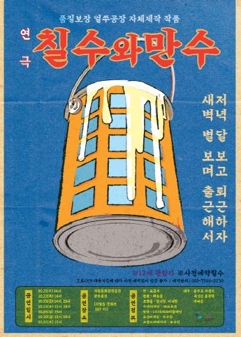 16일 군에 따르면 얼쑤공장은 매년 자체기획공연을 선보이고 있는 가운데 이달 21일부터 31일까지 총 10회에 걸쳐 전국 각지의 젊은 배우들이 가평에 모여 만든 ‘칠수와 만수’작품을 선보인다고 밝혔다.