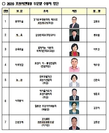 수상자로는 문화예술부문 김영오 포천메나리회장, 체육부문 류귀열 삼성중학교 부장교사, 교육학술부문 이혜경 함께하는 다문화 국제대안학교 교감, 지역개발부문 채수정 포천시 이통장연합회장, 농업부문 신현숙 한국생활개선 포천시연합회장, 사회봉사 부문 양윤호 새마을지도자 포천시협의회장과 김경자 일동면 주민자치위원장, 산업경제부문 김병균 경기북부환편공업협동조합 이사장 등이 선정됐다.