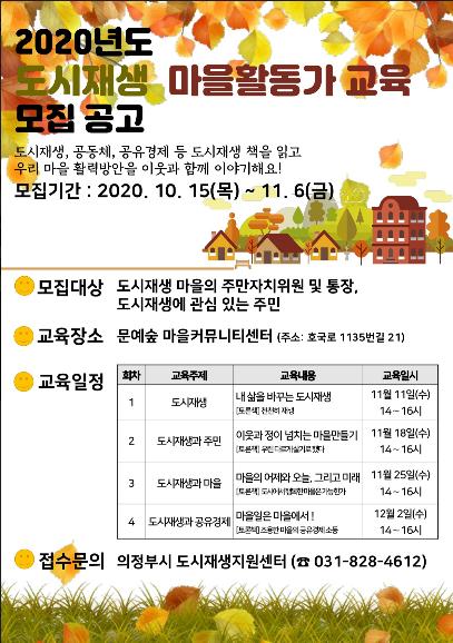 [KNT한국뉴스타임] 의정부시는 11월 11일부터 4주간, 지속가능한 도시재생 마을활동 구상을 위한 마을리더 및 활동가 10여 명을 대상으로 ‘도시재생 마을활동가 교육’을 실시한다고 밝혔다.