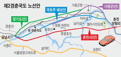이에따라 최근 강원지역 언론보도를 통해 제2경춘국도 국토부 대안노선의 경기도와 가평군 협의가 난항이 예상된다.