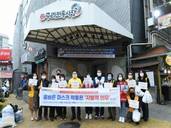 [KNT한국뉴스타임] 구리시는 지난 16일 대한적십자사봉사회 구리지구협의회 주관으로 함정현 적십자회장 등 20여명이 참여한 가운데, 구리전통시장에서 코로나19 확산방지를 위한 마스크 착용 의무화 캠페인을 전개했다.