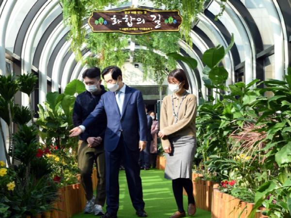 먼저 본관에서 별관으로 넘어가는 연결통로는 동과 서를 연결하는 공간의 의미로 동서화합을 상징하는‘화합의 길’로 다양성을 강조하는 컨셉으로 통로 양측에 화단을 만들고 생화와 조화를 혼합 식재하는 한편 천정에는 식물을 매달아 온실과 같은 느낌을 연출했다.