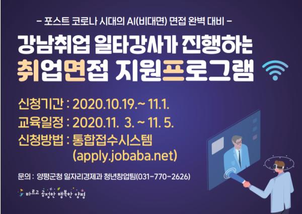 [KNT한국뉴스타임] 양평군은 청년 구직자(만 18세 ~39세)들의 취업역량을 강화하고, 성공적인 취업을 지원하고자 2020년 양평군 청년 취업 면접 지원프로그램(2기)를 실시한다고 밝혔다.