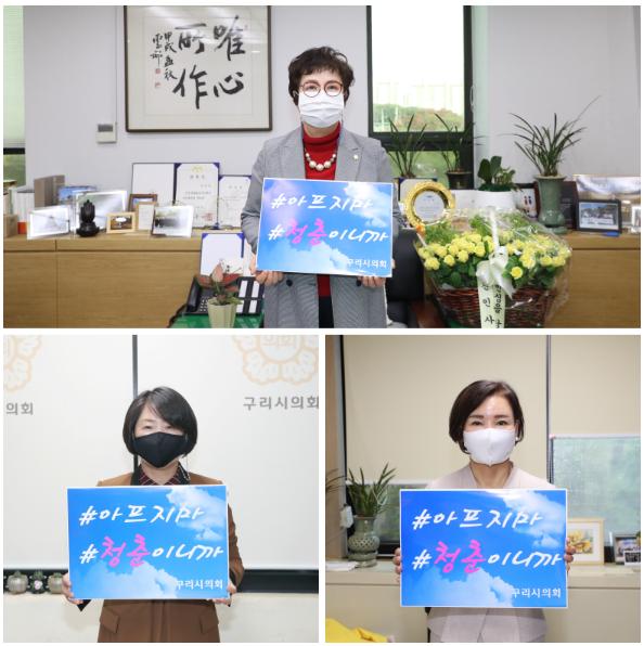 구리시의회(의장 김형수) 임연옥 부의장, 장승희 의원, 양경애 의원이 지난 16일 “아프지마, 청춘 챌린지”에 동참해 대한민국 모든 청년에게 용기와 응원 메시지를 전했다.