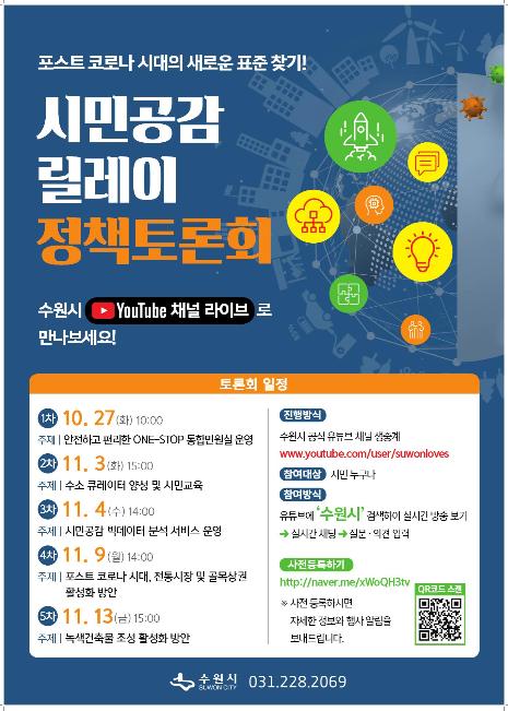 [KNT한국뉴스타임] 수원시가 ‘포스트코로나 시대’의 새로운 표준을 선도할 정책과제를 발굴하는 ‘시민 공감 릴레이 정책토론회’를 연다.