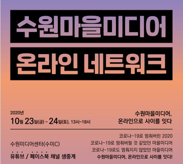 수원시지속가능도시재단 수원미디어센터는 23~24일 오후 1시부터 6시까지 ‘수원마을미디어, 온라인으로 사이를 잇다’를 주제로 ‘수원마을미디어 온라인 네트워크’를 연다. 이번 행사는 수원미디어센터가 주최하고, 수원마을미디어연합이 주관한다.
