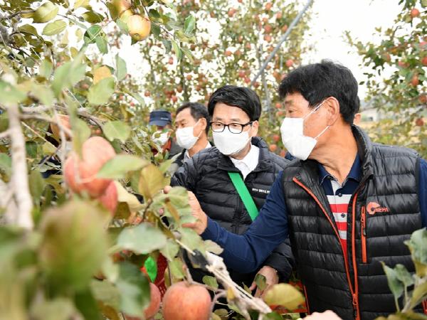 [KNT한국뉴스타임] 최종환 파주시장이 지난 21일 파주시 오도동에서 7년째 사과를 재배하고 있는 사과농장(농가주 내종국/8,250㎡/1,000주)을 방문했다.