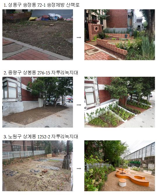 한편, 특별한 쓰임 없이 방치됐던 우리 주변의 자투리 공간을 작지만 활력 넘치는 휴식공간으로 탈바꿈하는 서울시의 ?72시간 프로젝트?는 2012년부터 추진하여 올해까지 9년 간 총 78개 공간을 조성하여 서울시 내 공원녹지 소외지역 해소에 일조하였다.