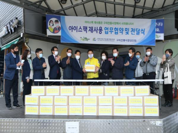 [KNT한국뉴스타임] 구리시 지속가능발전협의회는 22일 구리전통시장에서 공동의장인 안승남 구리시장, 임순빈 공동의장, 조종덕 전통시장 상인회 회장 등 관계자 20여명이 참석한 가운데에 아이스팩 재사용 사업을 위한 업무 협약식을 가졌다고 밝혔다.