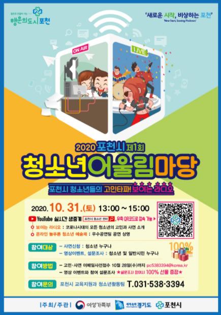 [KNT한국뉴스타임] 포천시는 오는 31일 오후 1시부터 포천시 청소년센터 유튜브 채널에서 비대면 ‘2020년 포천시 청소년어울림마당’을 개최한다고 밝혔다.