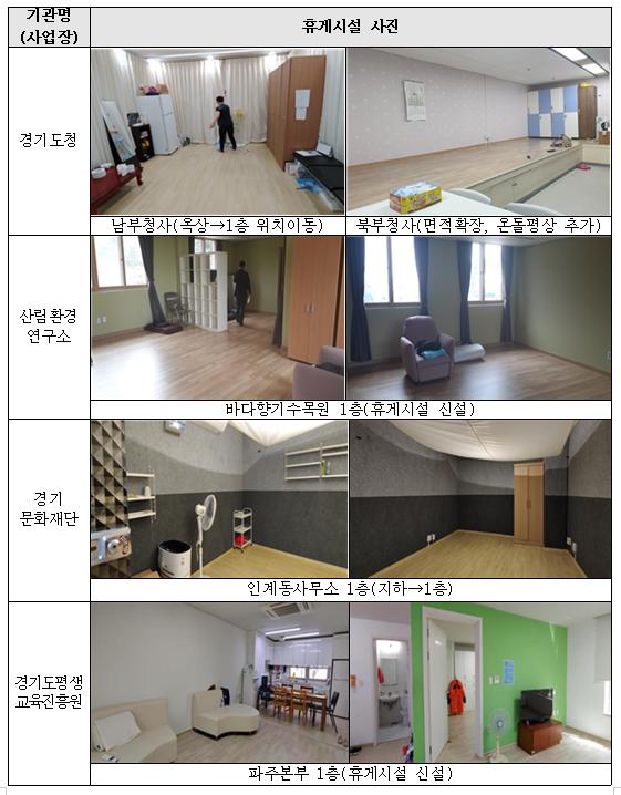 실제로 비좁았던 경기도청 북부청사 휴게실을 확장(여자 휴게실 기준 16.52㎡→35.52㎡)하고, 겨울에도 따뜻한 환경에서 휴식을 취할 수 있도록 온돌평상을 설치했다. 남부청사 휴게실 역시 옥상에 있었던 것을 1층으로 옮겨 높은 곳을 오르내리는 수고 없이 마음껏 휴게공간을 이용토록 조치했다.