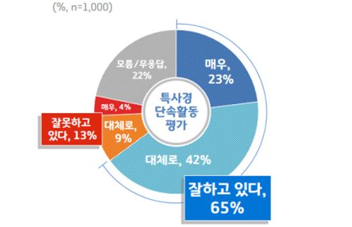 먼저 특사경 활동에 대해 도민 65%가 ‘잘하고 있다’고 평가했으며 도민의 88%가 ‘특사경 활동이 안전한 도민생활과 공정한 경기도를 만드는 데에 도움이 될 것이다’고 응답했다. 앞으로 특사경을 더욱 확대?강화해 나가는 것에 대해서는 도민 85%가 ‘찬성한다’고 답했다.