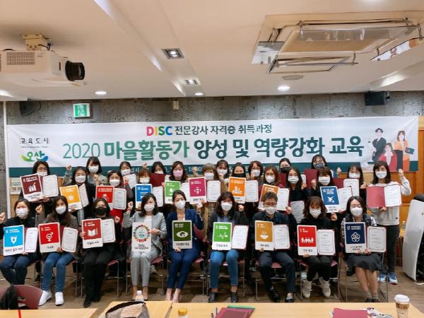 마을주민강사 25명이 참여한 이번 교육은 DISC 전문강사 자격증 취득 과정으로 주도형(Dominace), 사교형(Influences), 신중형(Conscientiousness), 안정형(Steadiness)의 행동유형을 크게 4가지로 분류해 행동유형을 파악하는 강사양성 과정으로 이를 통해 나를 이해하고 타인을 이해하며 더 나아가 갈등을 극복하는 방법을 배우는 과정이다.