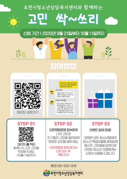[KNT한국뉴스타임] 포천시청소년상담복지센터는 지난 24일 고민 싹~쓰리 온라인 아웃리치를 실시했다고 밝혔다.