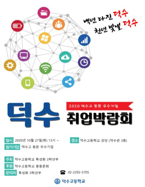 [KNT한국뉴스타임] 서울특별시교육청 관내 덕수고등학교와 덕수고등학교총동창회는 10월 27일(화) 13:00~17:00 덕수고등학교에서 「2020 덕수고 동문 기업 취업박람회」를 개최한다.