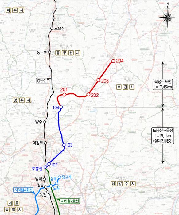 도봉산 포천선(옥정~포천) 전철 7호선 연장사업은 지난해 1월 국가균형발전 프로젝트에 선정되어 예비타당성 조사를 면제받았다. 15만 포천시민이 하나가 되어 만든 쾌거라는 평가를 받았다. 지난해 11월에는 사업계획 적정성 검토가 완료되어 올해 초 기본계획 수립용역이 착수될 것으로 보인다. 시는 총사업비의 약 10%에 해당하는 광역철도 건설분담금 확보를 위해 일찌감치 ‘포천시 철도건설기금의 설치 및 운용에 관한 조례’를 제정해 철도건설기금을 조성하는 등 사업이 조속히 추진될 수 있도록 만반의 준비를 다 하고 있다. 시는 연계 교통과 역세권 개발 등 관련 계획을 함께 수립해 더욱 살기 좋은 포천시를 만들겠다고 약속했다.
